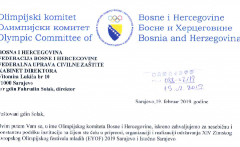 Zahvalnica Olimpijskog komiteta BiH FUCZ za podršku u pripremi i uspješnoj realizaciji EYOF-a 2019