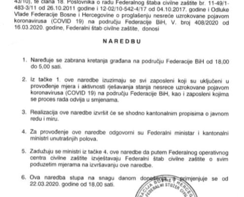 Naredba FŠCZ o uvođenju zabrane kretanja građana na području…