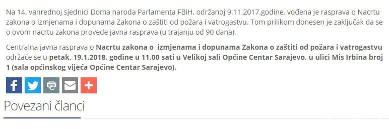 Na 14. vanrednoj sjednici Doma naroda Parlamenta FBiH, održanoj 9.11.2017.godine, vođena je rasprava o Nacrtu zakona o izmjenama i dopunama Zakona o zaštiti od požara i vatrogastvu. Tom prilikom donesen je zaključak da se o ovom nacrtu zakona provede javna rasprava (u trajanju od 90 dana).